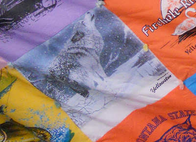 dave riss: owner, designer, creator of 37 years displays a handmade quilt made of t-shirt designs from previous years |